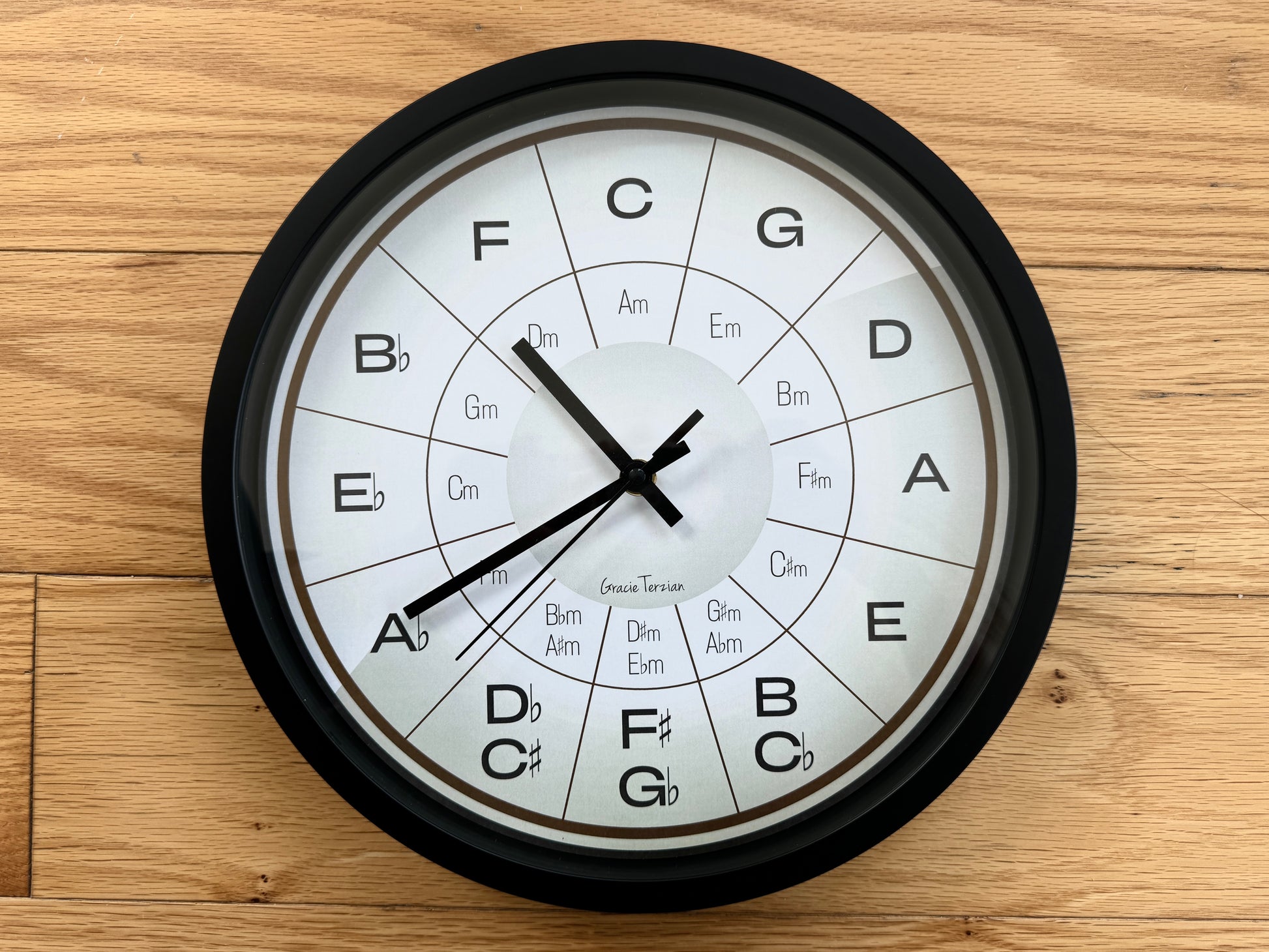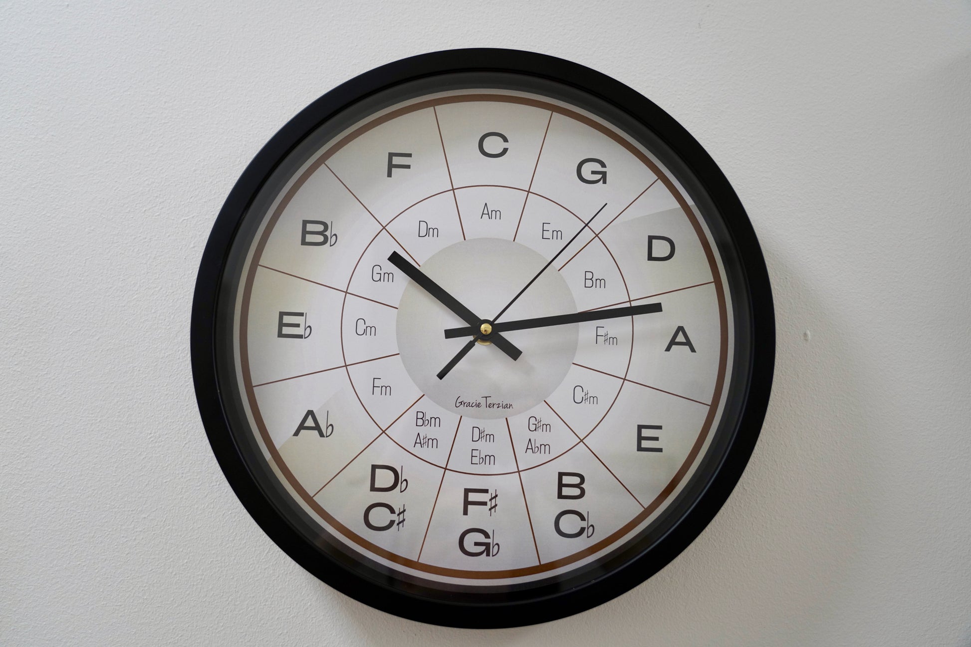 A high-quality Circle of 4ths and 5ths Clock with the major and minor keys displayed. The clock is made with a glass front and takes 1 double A battery to operate (battery is not included). The diameter of the clock is 12 inches. There is a keyhole hanger on the back of the clock so you can easily hang it from a nail on the wall. There is also a continuously moving second hand.
